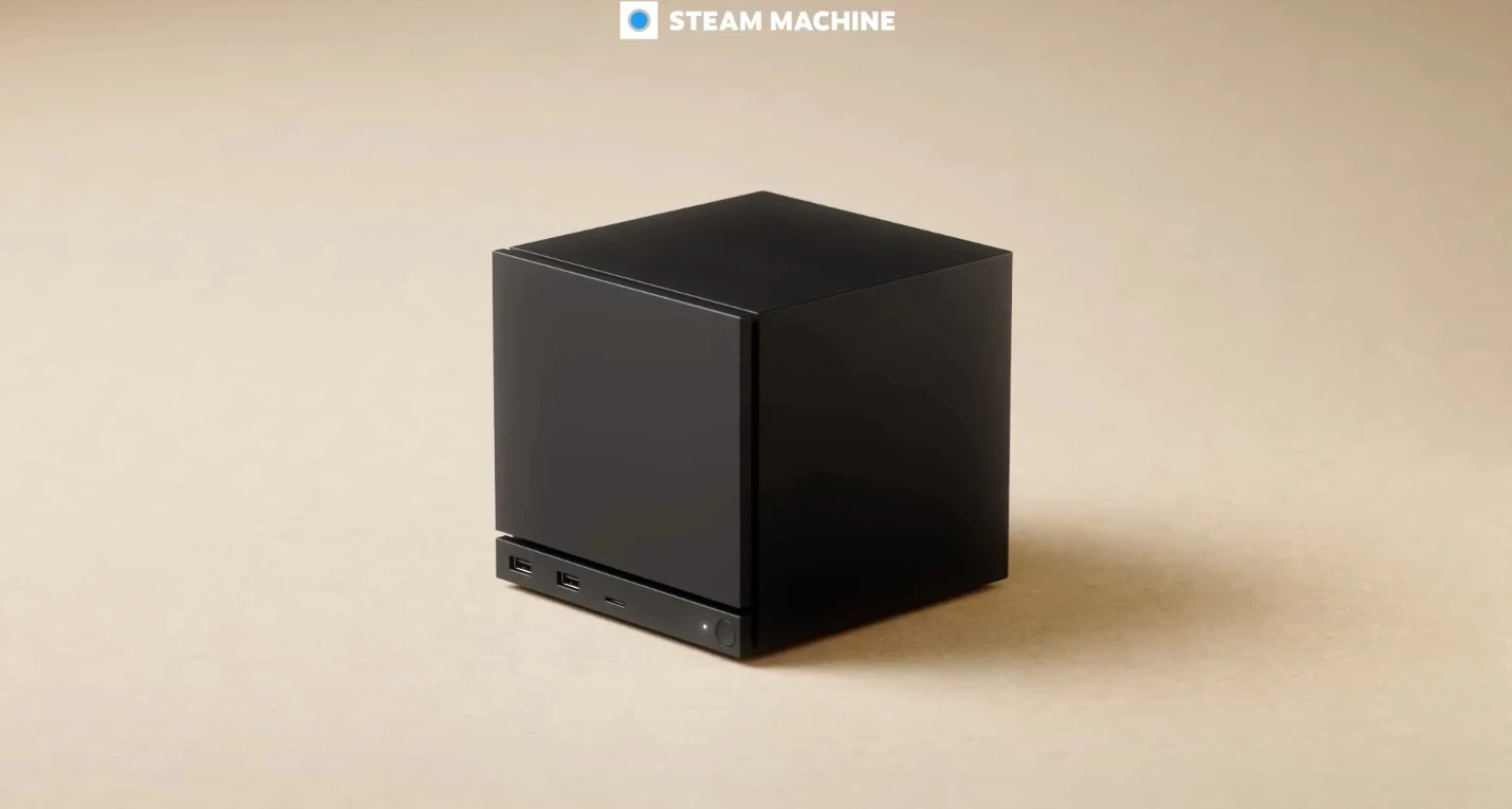 А теперь рассмотрим новинки поближе! Steam Machine — это готовый компьютер, который в шесть раз мощнее Steam Deck. Он будет работать на базе SteamOS в форм-факторе компактного куба. Среди портов есть как один USB-C и четыре USB-A, так и HDMI 2.0, DisplayPort 1.4 и разъём для подключения к сети по проводу. Естественно, поддержка Wi-Fi и Bluetooth тоже имеется.
