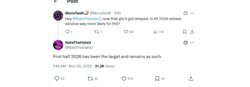 По словам NateTheHate, релиз Forza Horizon 6 в первой половине 2026-го «был и остаётся целью». Это окно он упоминал ещё в августе, поэтому вряд ли дело в «гиганте» Rockstar Games.