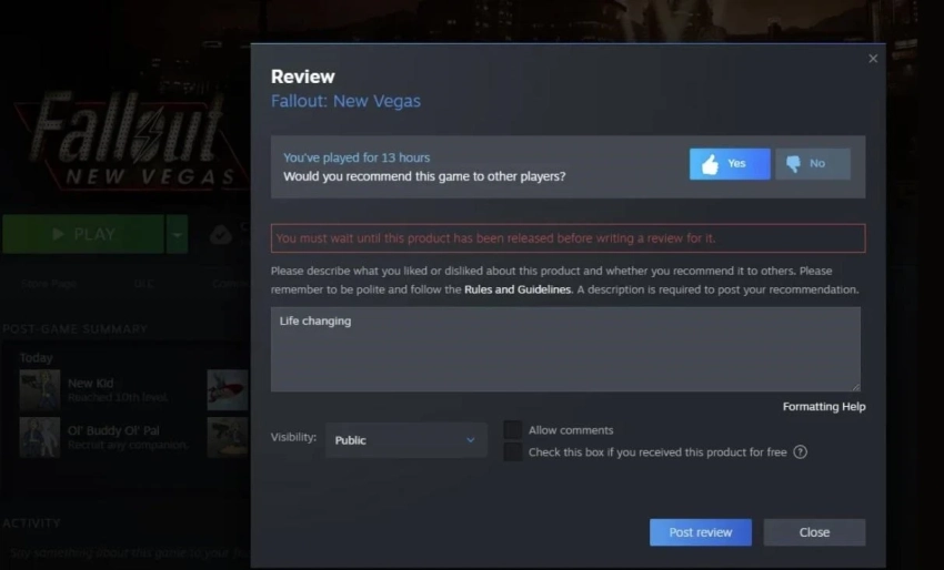 Обложка: скриншот Fallout: New VegasФанаты Fallout: New Vegas так долго и преданно ждут ремастер, что даже ошибка в Steam начинает казаться намёком. Геймер попытался оставить отзывы к игре, но столкнулся с системным сообщением. Оно призывало дождаться выхода продукта, прежде чем писать комментарий.
