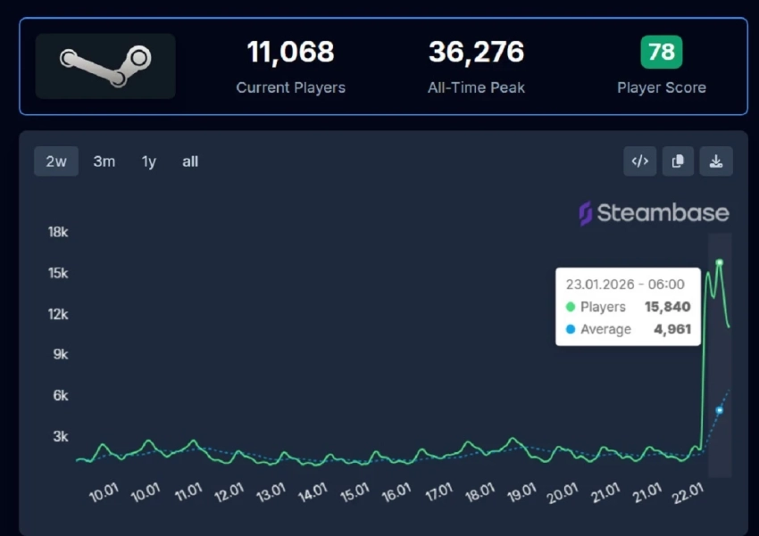 Свежее обновление и бесплатные выходные смогли привлечь к игре свыше 16 тысяч человек (16,057) на пике за последние 24 часа. В последний раз подобные показатели наблюдались лишь в первые дни после выхода No Rest for the Wicked в раннем доступе.