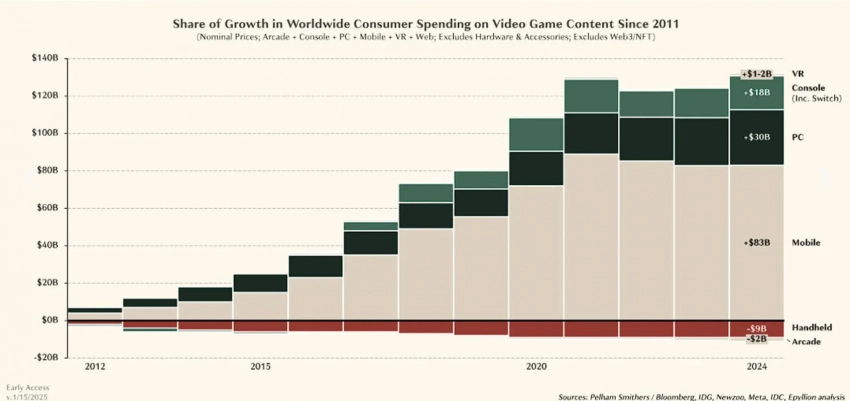«Перегнать» PC-направление консолям не помог и рост трат пользователей (18 млрд долларов), который вырос на 75% в 2024 году по сравнению с 2011-м.