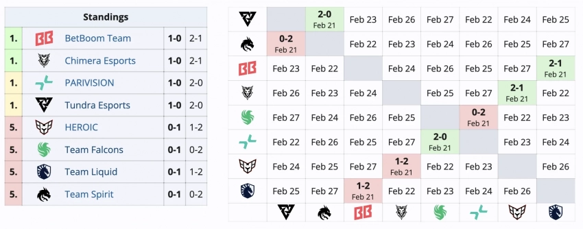 Игровой день 22 февраля начнется с противостояния Spirit и BB Team, затем встретятся Liquid и Chimera, далее сыграют HEROIC и Falcons, а завершат день Tundra и PARIVISION.