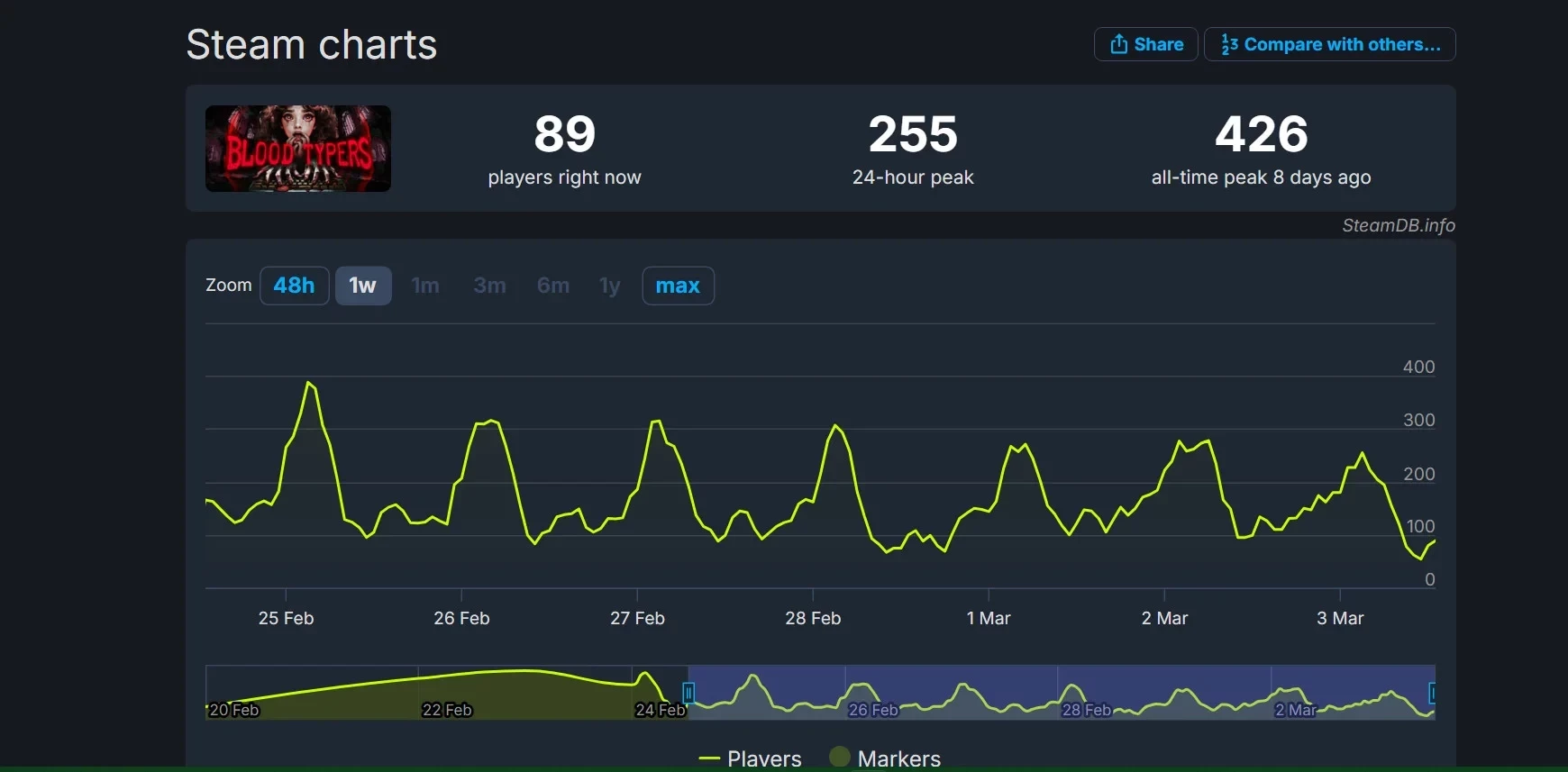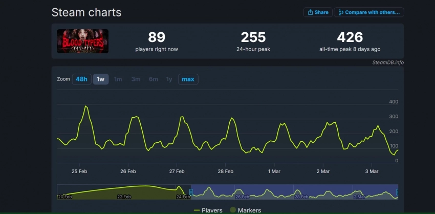 В пользовательских отзывах Blood Typers хвалят за разнообразных персонажей, необычный геймплейный опыт с использованием клавиатуры и жуткую атмосферу. Пиковый онлайн не может похвастаться высокими значениями — он добрался лишь до 426 единовременных игроков вскоре после релиза. Однако найти партнёров для многопользовательского прохождения не составит труда — ежедневный пик ещё не падал ниже 50-ти человек.