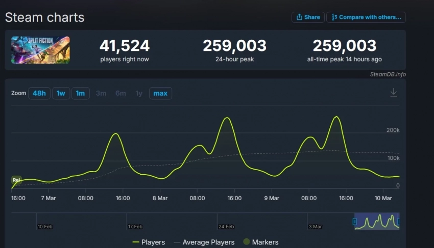 Напомним, что Split Fiction оказалась самым популярным платным релизом EA в Steam. Её пиковый онлайн превышает игры серий Battlefield и FIFA, Dragon Age: The Veilguard и другие тайтлы.