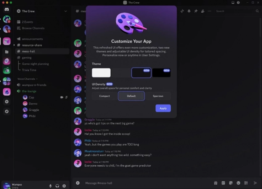 Что касается обновления дизайна Discord, то в нём появились некоторые функции из мобильной версии, а также расширенные возможности для кастомизации. Всего будет четыре бесплатные темы, а также три варианта «плотности» расположения элементов интерфейса. Размер списка каналов также получится изменить, что полезно для отображения вкладок с длинным названием.