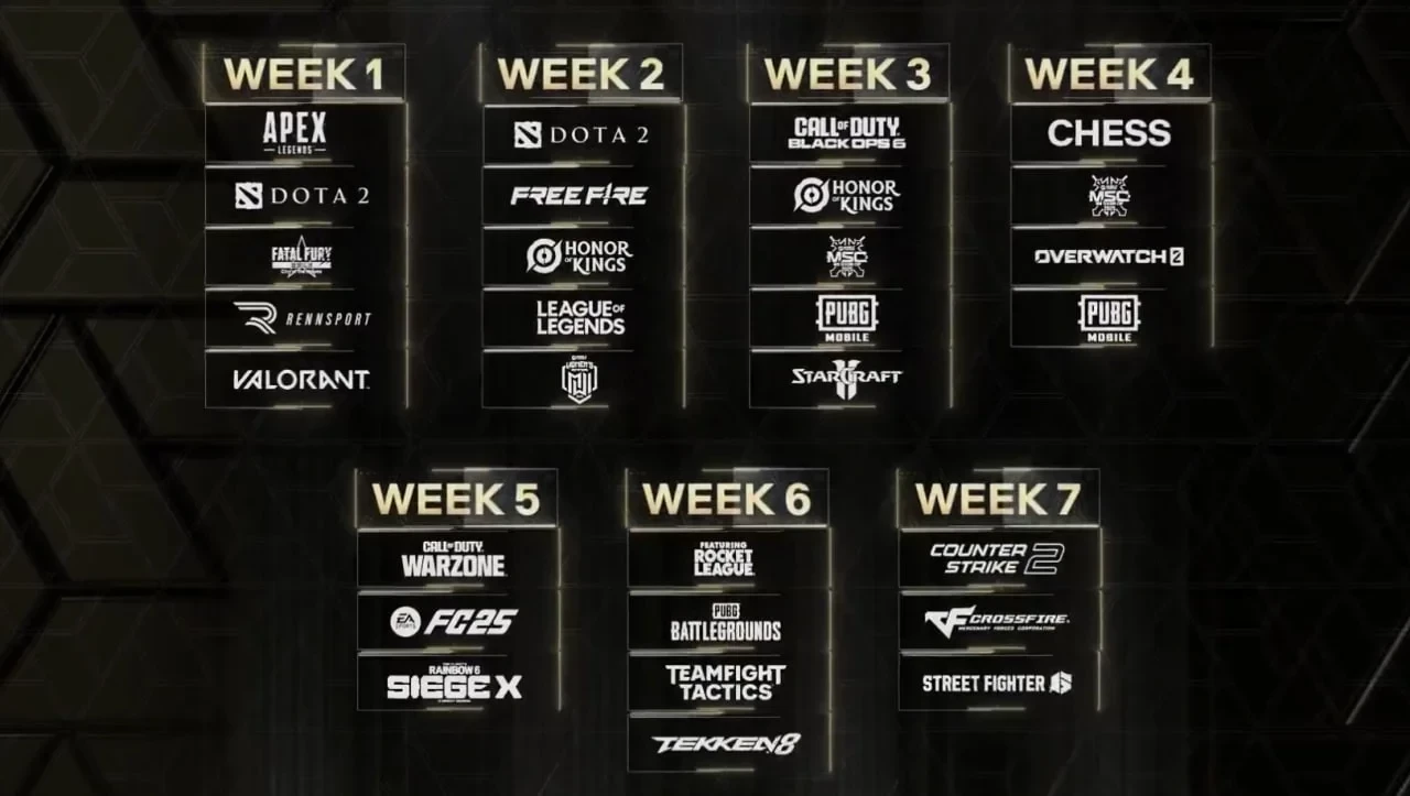 • Третья неделя (22-27 июля): Call of Duty: Black Ops 6, Honor of Kings, Mobile Legends: Bang Bang (турнир середины сезона), PUBG Mobile и StarCraft 2;