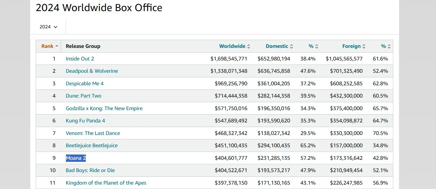 «Моана 2» обошла «Плохих парней до конца» и стала 9-м самым кассовым фильмом 2024 года