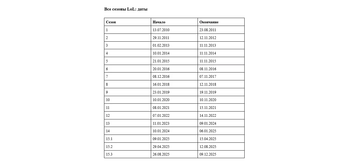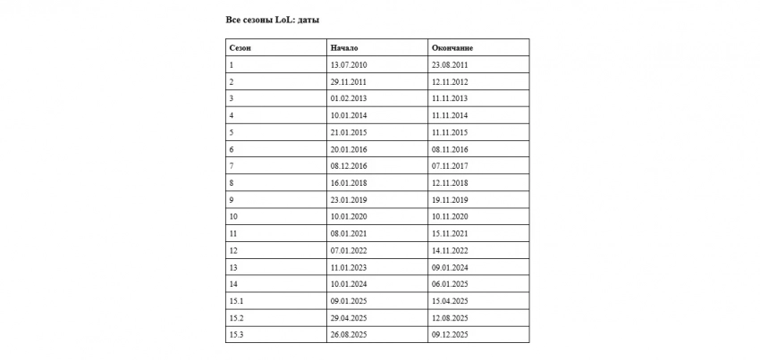 Даты начала и окончания всех сезонов League of Legends