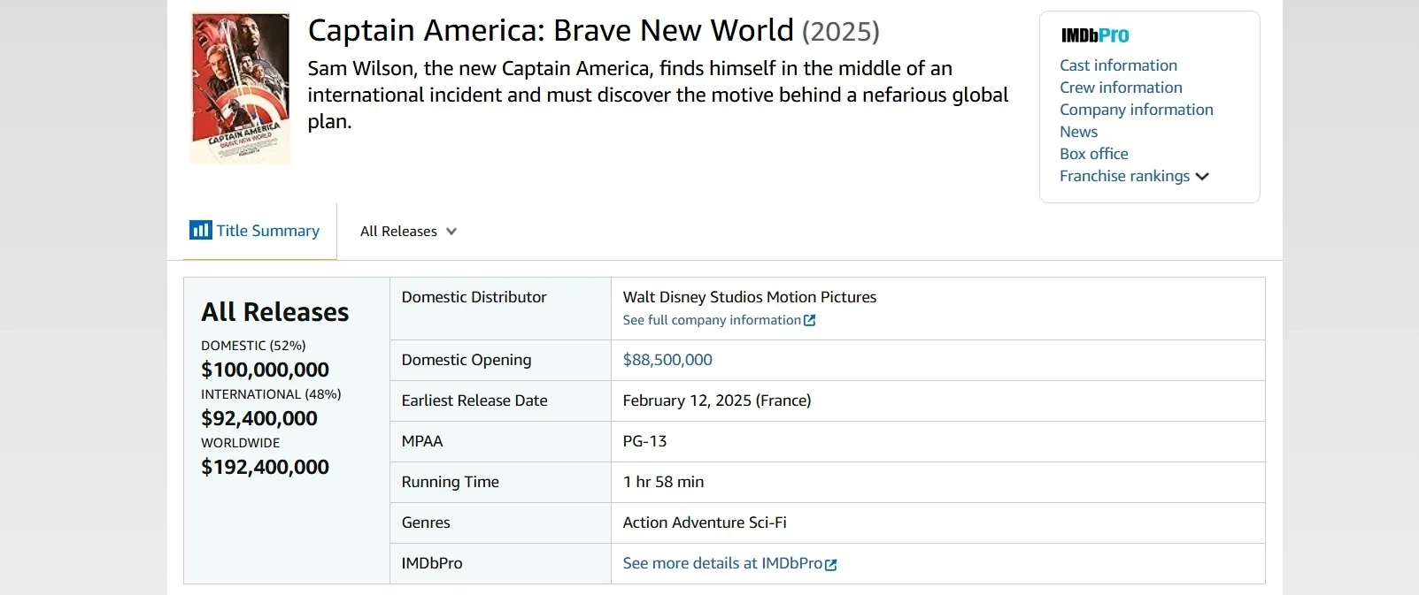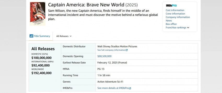 Самое интересное о кино на YouTube канале Игромании!Обложка: постер фильма «Капитан Америка: Новый мир»Мировые сборы нового супергеройского боевика «Капитан Америка: Новый мир» составили 192,4 млн долларов.