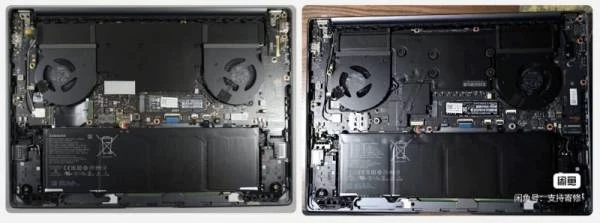 На предоставленной фотографии Galaxy Book 4 Pro видно, что система охлаждения новинки подверглась некоторому обновлению по сравнению с предшественником. Однако в её составе по-прежнему используются два вентилятора и испарительная камера, установленная поверх чипов CPU и GPU. На фото слева (ниже) показаны внутренности модели Galaxy Book 3 Pro, справа находится модель Galaxy Book 4 Ultra.