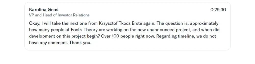 Зачем нам эта информация? Да ходит слух, что «Ведьмак 3: Дикая Охота» может получить ещё одно дополнение. И якобы над ним работает Foolʼs Theory. Слух всплыл в июне этого года и привлёк внимание самой CDPR, которая не подтвердила и не опровергла информацию.