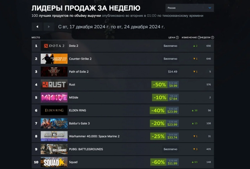 Лидеры продаж Steam с 17 по 24 декабря
