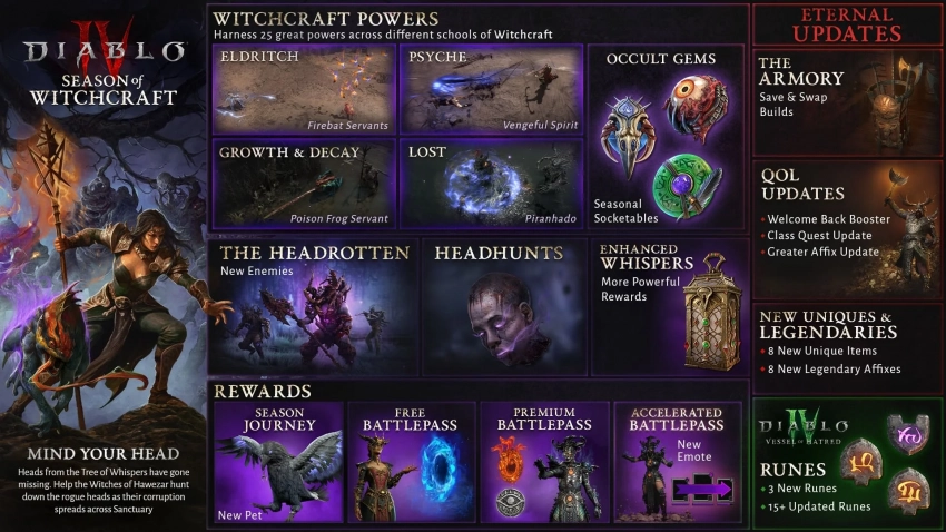 Самое интересное о кино на YouTube канале Игромании!Обложка: постер Diablo IV21 января в Diablo IV начался новый сезон, который получил название «Сезон ведьмовства». Игрокам предстоит найти сбежавшие головы с Шепчущего древа и, освоив новые способности, одолеть новый вид чудовищ — гнилоголовых.
