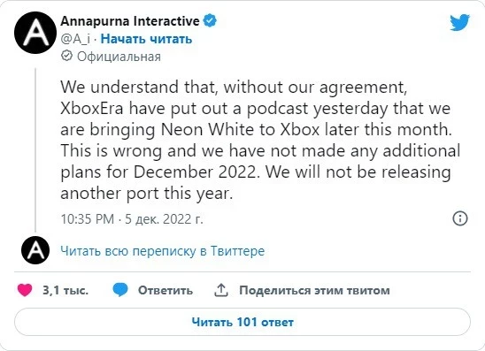 Компания опровергла информацию Бейкера, заявив, что не планировала ничего на декабрь 2022 года, а порт Neon White для PlayStation будет единственным в этом году. Судя по всему, владельцам Xbox придется ждать до 2023-го.