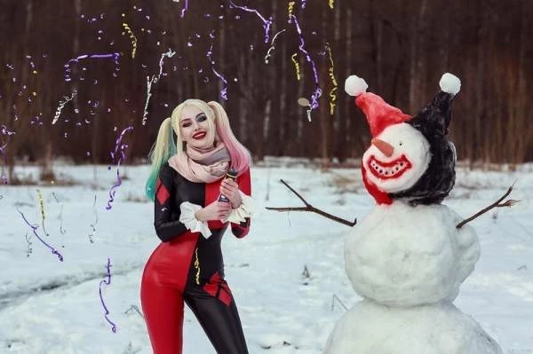 Редкое сочетание: Харли Квинн и зима. В Готэме снег редкое явление, тем более полноценные сугробы. У Виктории Кот вышел креативных образ.