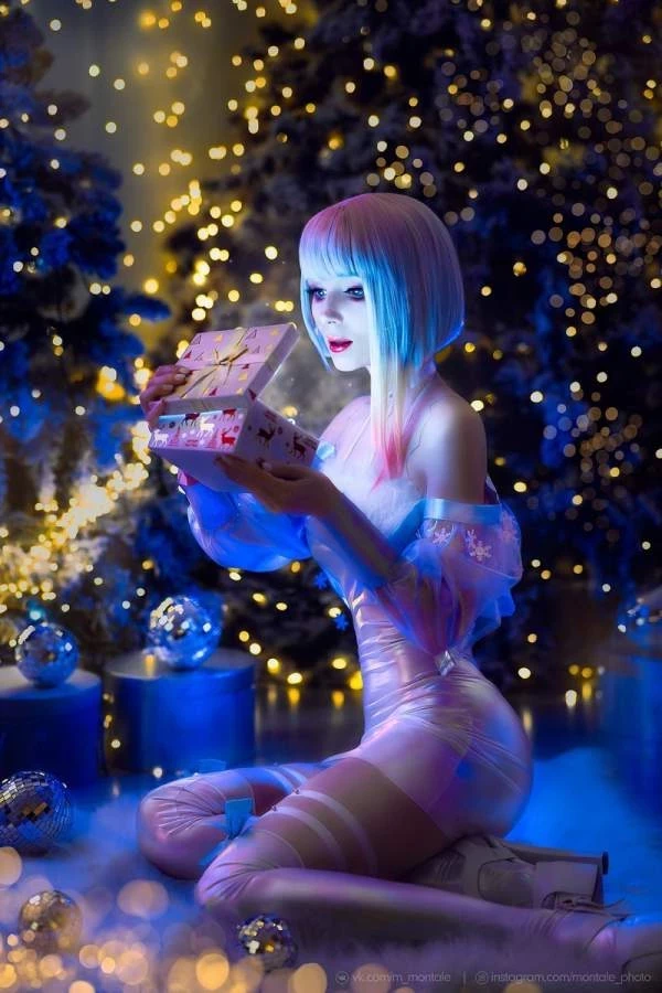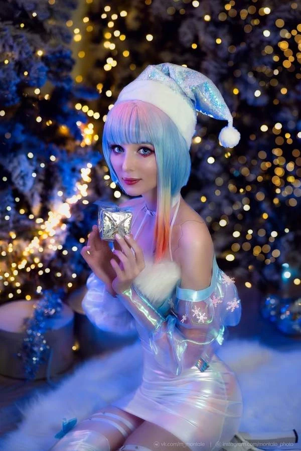 Люси стала любимицей интернета после Cyberpunk Edgerunners. Хоть Ребекка тоже приглянулась многим, но яркий образ Люси привлекает большее количество косплееров, а некоторые создают и вовсе совсем уникальные работы. Например, такой новогодний образ, который воплотила в жизни Марина Монталь.